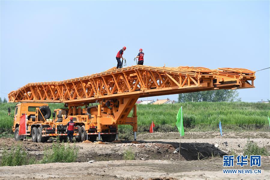 7月10日,工作人員在演練現(xiàn)場搭建機械化橋梁。當(dāng)日,由吉林省交通運輸廳主辦的公路橋梁水毀搶通應(yīng)急演練在長春市雙陽區(qū)雙陽河舉行,參與演練人員從汛情水毀信息報送、應(yīng)急裝備快速集結(jié)、機械化橋梁搶通搭設(shè)、善后處理等方面進行實戰(zhàn)演練。新華社記者張楠攝