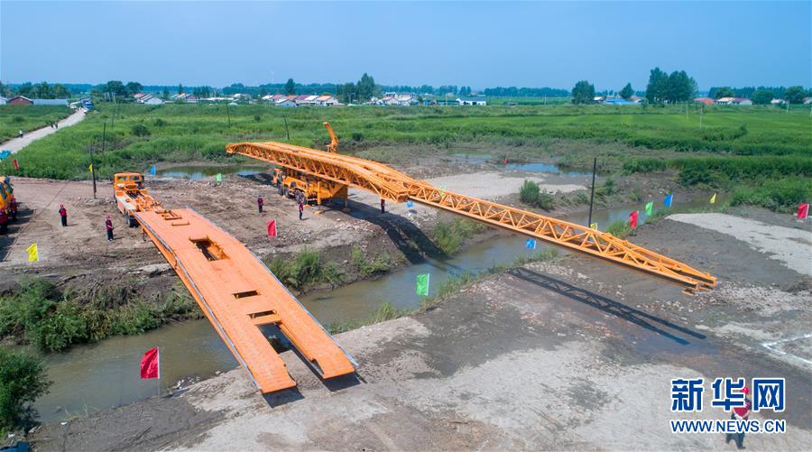 7月10日,工作人員在演練現(xiàn)場搭建機(jī)械化橋梁(無人機(jī)照片)。當(dāng)日,由吉林省交通運輸廳主辦的公路橋梁水毀搶通應(yīng)急演練在長春市雙陽區(qū)雙陽河舉行,參與演練人員從汛情水毀信息報送、應(yīng)急裝備快速集結(jié)、機(jī)械化橋梁搶通搭設(shè)、善后處理等方面進(jìn)行實戰(zhàn)演練。新華社記者張楠攝