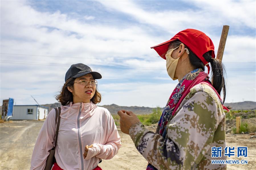在新疆精河縣城近郊,朱虹美(右)與合作的杞農(nóng)陳克琴在交流(7月11日攝)。新華社記者 胡虎虎 攝