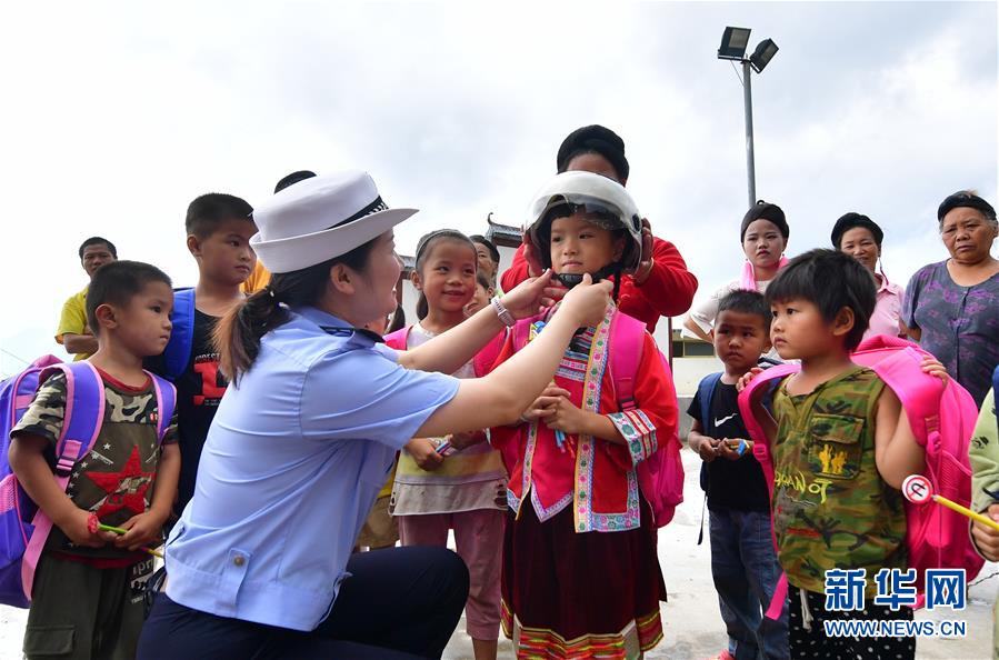 7月11日,柳州市交警支隊民警指導(dǎo)小朋友正確佩戴頭盔。當日,廣西柳州市交警支隊的民警來到融水苗族自治縣大浪鎮(zhèn)大新村紅鄧屯教學(xué)點,開展暑期交通安全教育活動,增強孩子們的安全出行意識。新華社記者黃孝邦攝