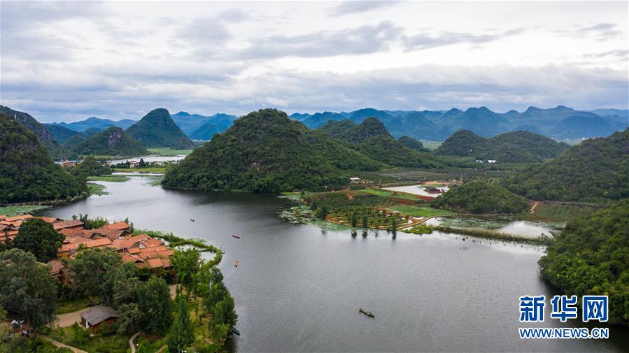 游人在普者黑國(guó)家濕地公園泛舟賞景(7月10日攝,無(wú)人機(jī)照片)。新華社記者 胡超 攝