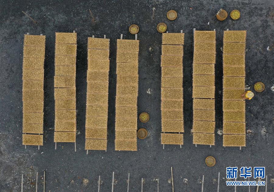 7月12日,祁東縣黃土鋪鎮(zhèn)雁隆食品公司內(nèi),工人在晾曬黃花菜(無人機(jī)照片)。新華社記者 趙眾志 攝