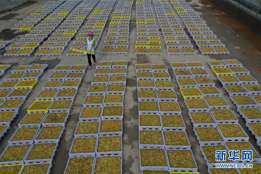 7月12日,祁東縣黃土鋪鎮(zhèn)雁隆食品公司內(nèi),工人在晾曬黃花菜(無(wú)人機(jī)照片)。新華社記者 趙眾志 攝