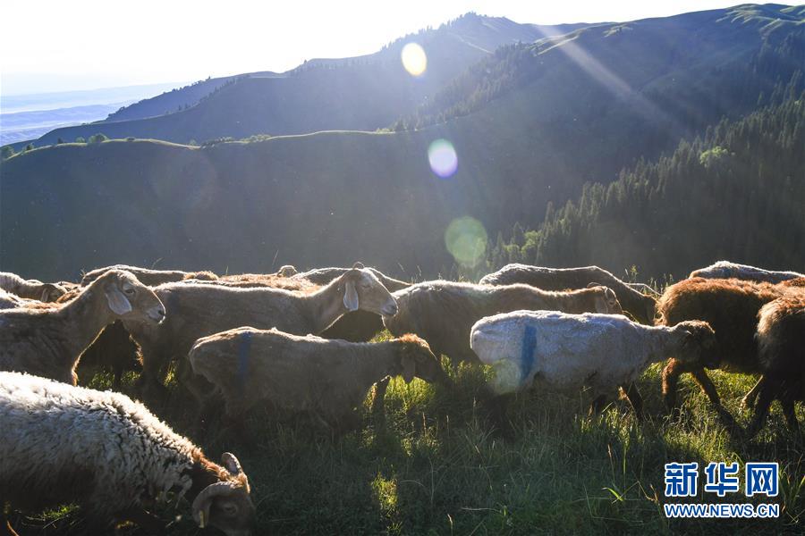 在新疆伊犁特克斯縣境內(nèi)的夏牧場里,羊群在吃草(7月2日攝)。新華社記者 王菲 攝