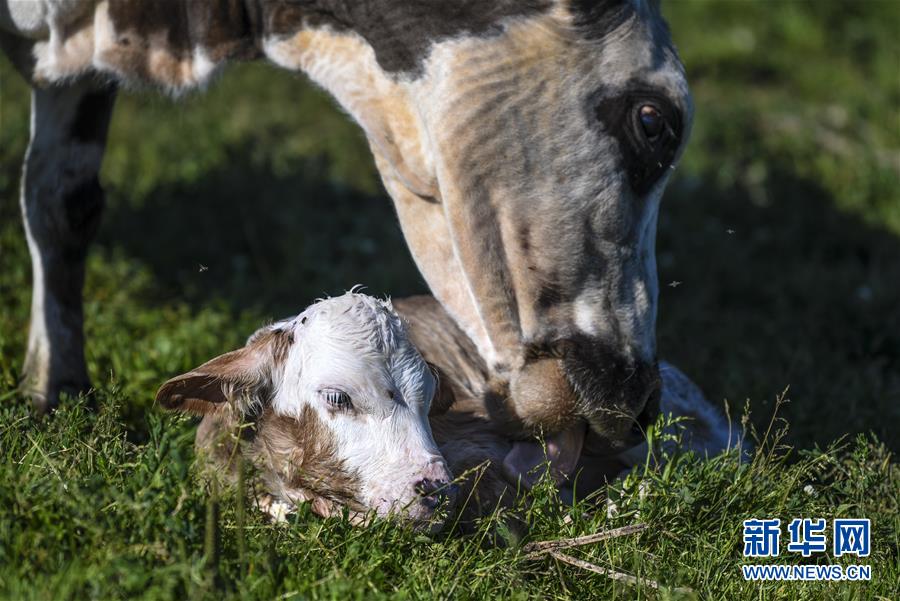在新疆伊犁特克斯縣境內(nèi)的夏牧場里,母牛在舔舐剛剛出生的牛犢(7月2日攝)。新華社記者 王菲 攝