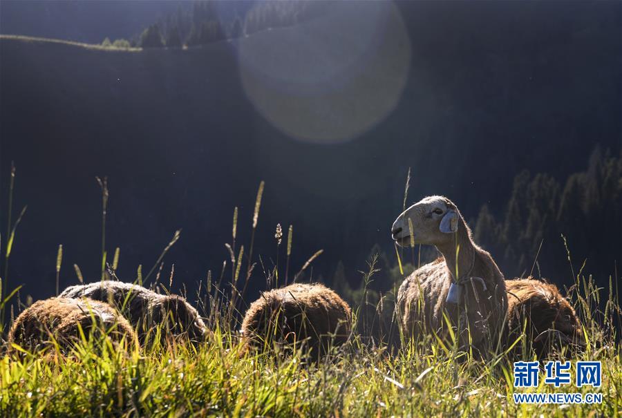 在新疆伊犁特克斯縣境內的夏牧場里,羊群在吃草(7月2日攝)。新華社記者 王菲 攝
