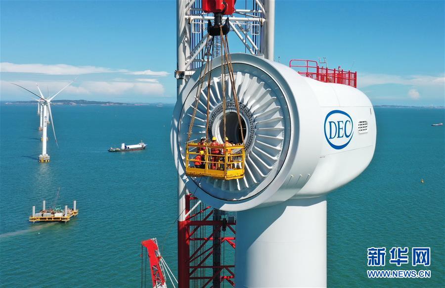 福建福清興化灣二期海上風(fēng)電場吊裝10兆瓦海上風(fēng)電機組(6月12日攝,無人機照片)。記者7月13日從三峽集團了解到,國內(nèi)首臺10兆瓦海上風(fēng)電機組日前在三峽集團福建福清興化灣二期海上風(fēng)電場成功并網(wǎng)發(fā)電,這是目前我國自主研發(fā)的單機容量亞太地區(qū)最大、全球第二大的海上風(fēng)電機組,刷新了我國海上風(fēng)電單機容量新紀(jì)錄。新華社記者 林善傳 攝