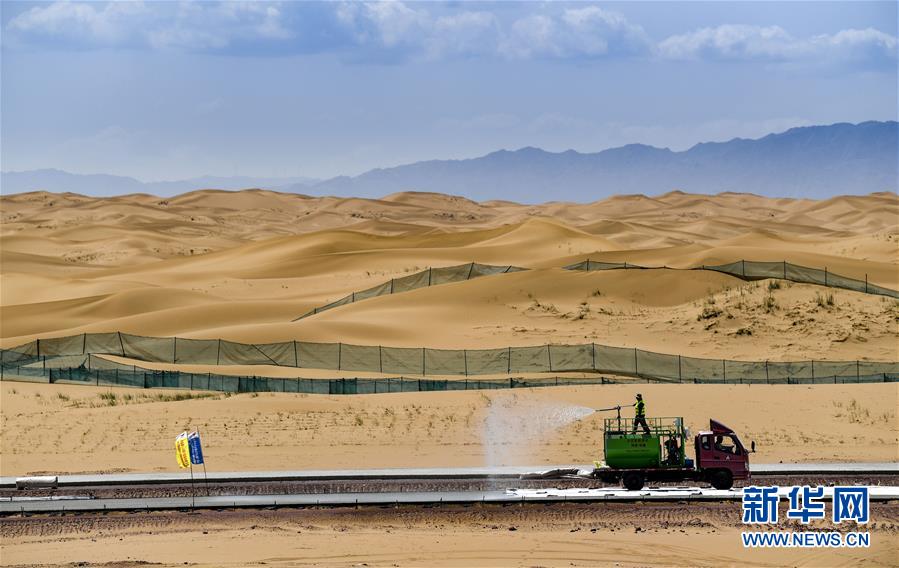 7月10日,工人在位于寧夏境內(nèi)的烏瑪高速青銅峽至中衛(wèi)段A9標(biāo)段施工。盛夏時(shí)節(jié),位于寧夏境內(nèi)的烏瑪(內(nèi)蒙古烏海市至青海瑪沁縣)高速青銅峽至中衛(wèi)段正在抓緊施工建設(shè)。該路段主線全長(zhǎng)122.9公里,其中穿越騰格里沙漠腹地的18公里公路是寧夏建設(shè)的首條沙漠高速公路,預(yù)計(jì)2021年建成通車。新華社記者馮開華攝