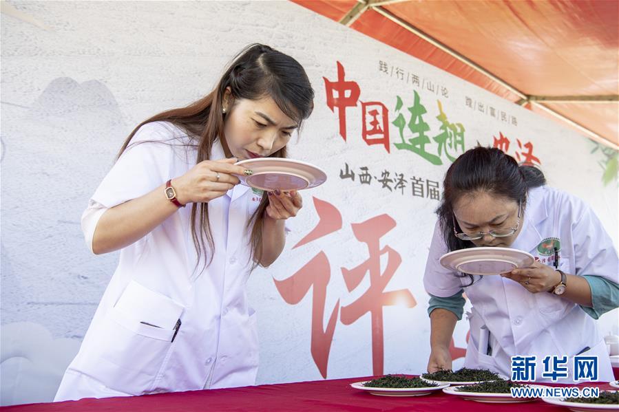 7月20日,在位于安澤縣飛嶺村的斗茶文化主題活動現(xiàn)場,比賽評委對制成的茶葉進(jìn)行評審。新華社記者楊晨光攝
