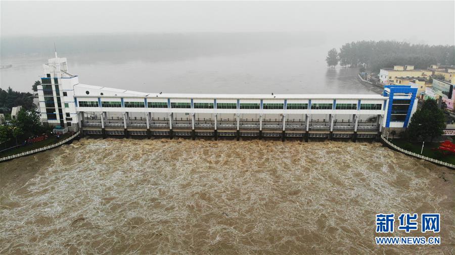 7月20日,洪水通過王家壩閘涌入蒙洼蓄洪區(qū)。當(dāng)日8時32分,淮河干流王家壩閘開閘泄洪。受近期強降雨影響,淮河干流王家壩站水位19日快速上漲,7月20日6時36分水位漲至29.66米,超過保證水位0.36米?;春油跫覊伍l開閘泄洪,蒙洼蓄洪區(qū)啟用。新華社記者黃博涵攝