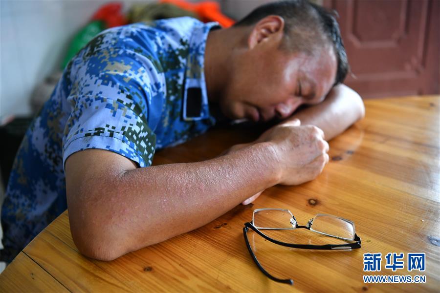 劉良武完成巡查后趴在桌上休息(7月19日攝)。新華社記者李鑫攝