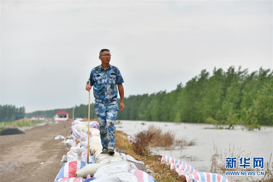 劉良武與巡查人員在堤壩內(nèi)側(cè)排查險(xiǎn)情(7月19日攝)。新華社記者李鑫攝