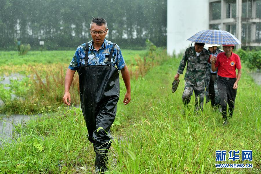 劉良武與巡查人員在堤壩內(nèi)側(cè)排查險情(7月19日攝)。新華社記者李鑫攝