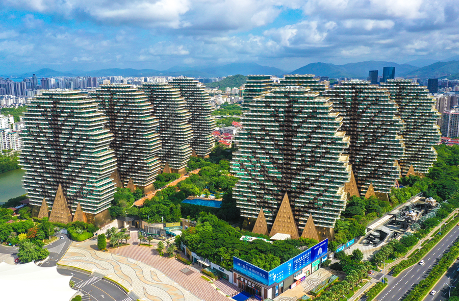 2020年7月20日,海南省三亞市,圖為航拍的“九棵大樹”建筑群,其具象性的建筑設(shè)計(jì)風(fēng)格,既有建筑之美,又見(jiàn)自然靈韻。