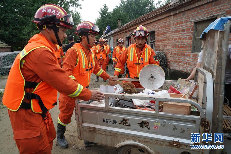 7月23日,淮安市消防救援支隊(duì)隊(duì)員在盱眙縣鮑集鎮(zhèn)新遷村幫助村民轉(zhuǎn)移車輛。當(dāng)日,受淮河盱眙段水位上漲影響,江蘇省淮安市盱眙縣啟動(dòng)鮑集圩行洪區(qū)萬(wàn)余名群眾撤離轉(zhuǎn)移工作,確保安全度汛。新華社記者韓瑜慶攝
