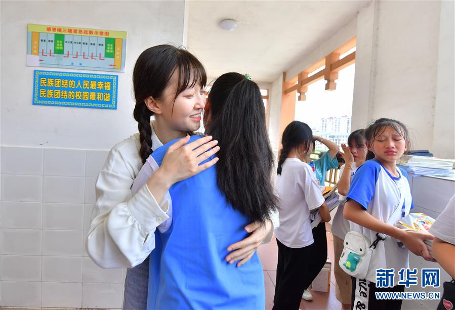 在融水苗族自治縣民族中學(xué)1818班舉辦的送別班會(huì)上,同學(xué)們和支教老師高潔(左一)擁抱告別(7月23日攝)。新華社記者黃孝邦攝