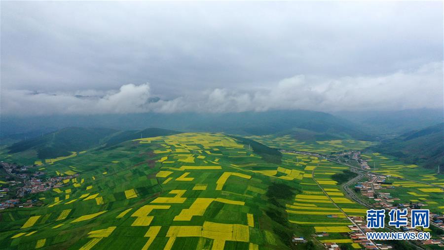 這是7月22日拍攝的門源回族自治縣境內(nèi)的油菜花田(無人機(jī)照片)。新華社記者 吳剛 攝