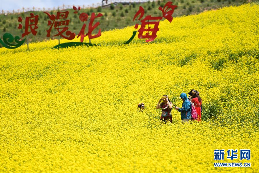 游客在門源回族自治縣的油菜花田中拍照(7月22日攝)。新華社記者 吳剛 攝