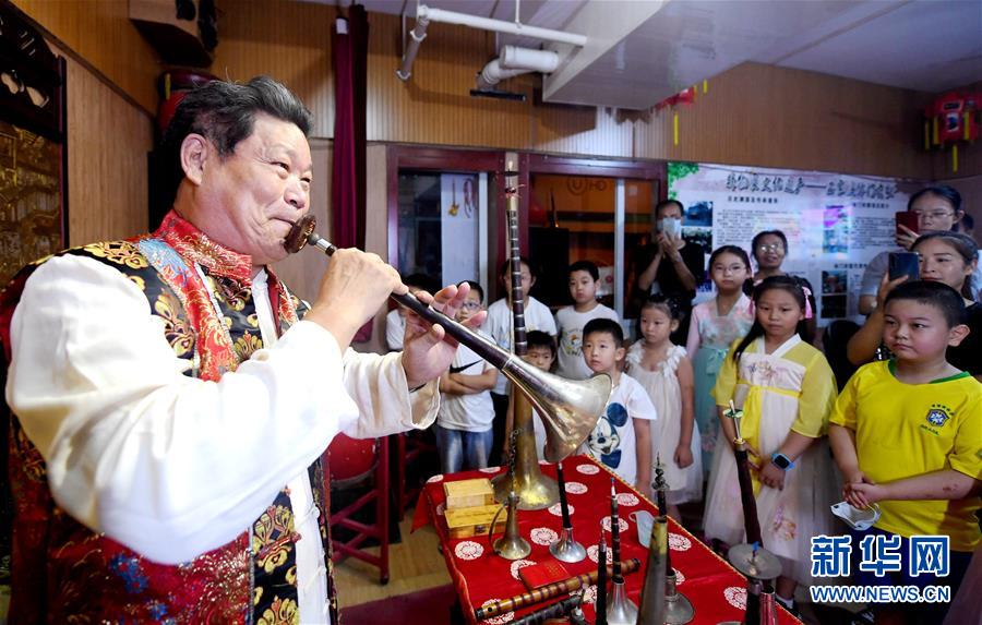 7月26日,在石家莊市橋西區(qū)休門街道休門西街社區(qū),休門吹歌傳承人付錫芬(左一)在傳授嗩吶吹奏技巧。當(dāng)日,河北省石家莊市橋西區(qū)暑期“非遺”小課堂開班。河北省級非物質(zhì)文化遺產(chǎn)休門吹歌傳承人走進休門街道休門西街社區(qū),為轄區(qū)小朋友講解休門吹歌歷史,傳授非遺技藝,豐富他們的暑期生活。新華社記者 王曉 攝