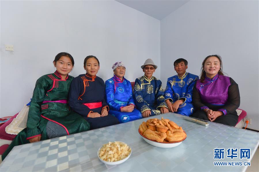 呼格吉勒一家在新房?jī)?nèi)合影,從左至右分別為:女兒蘇日娜、妹妹阿榮高娃、母親烏云格日勒、父親孟克敖其爾、呼格吉勒、妻子薩如拉(7月26日攝)。新華社記者徐欽攝