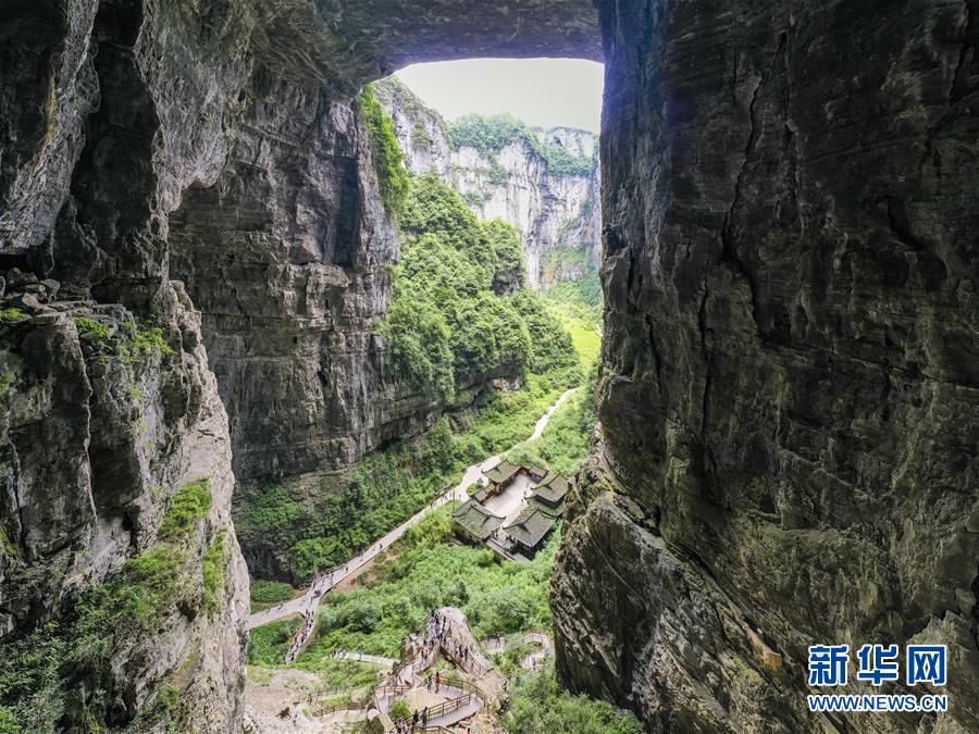 7月29日,游客在天生三橋景區(qū)內(nèi)的天龍橋景點(diǎn)游覽(無人機(jī)照片)。新華社記者劉潺攝