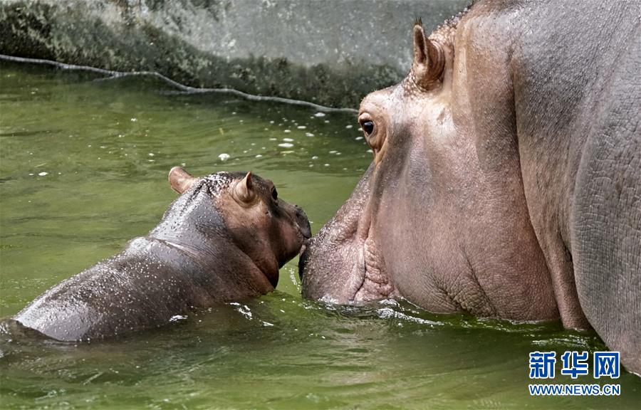 北京動(dòng)物園的河馬母子在恒溫水池內(nèi)乘涼(7月30日攝)。炎炎夏日,北京動(dòng)物園根據(jù)動(dòng)物生活習(xí)性,為動(dòng)物配備了自動(dòng)噴淋?chē)婌F、空調(diào)籠舍、恒溫水池、遮陽(yáng)棚等各類(lèi)避暑設(shè)施,同時(shí)還準(zhǔn)備了西瓜等降溫食品,保障動(dòng)物平安舒適地度過(guò)伏天。新華社記者李欣攝