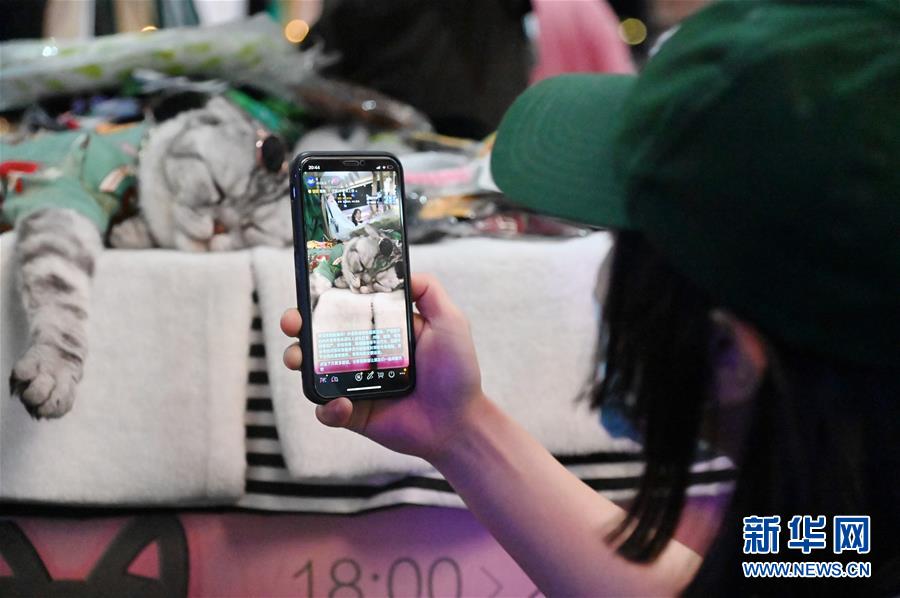在“夜貓市集”上,一名女孩在直播自己領(lǐng)養(yǎng)的寵物貓(7月29日攝)。新華社記者張浩然攝