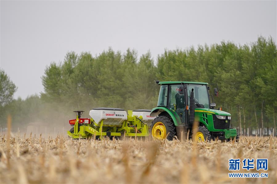 5月7日,在吉林省梨樹縣,農民駕駛免耕播種機播種玉米。新華社記者張楠攝