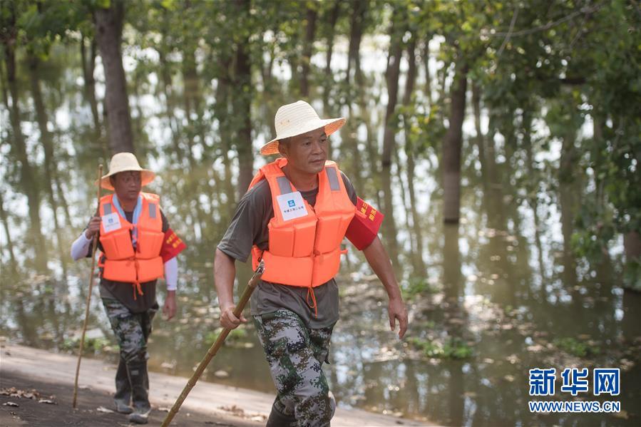 8月5日,夏德勤(右)與同事在長(zhǎng)江武金堤迎水面巡查。新華社記者肖藝九攝