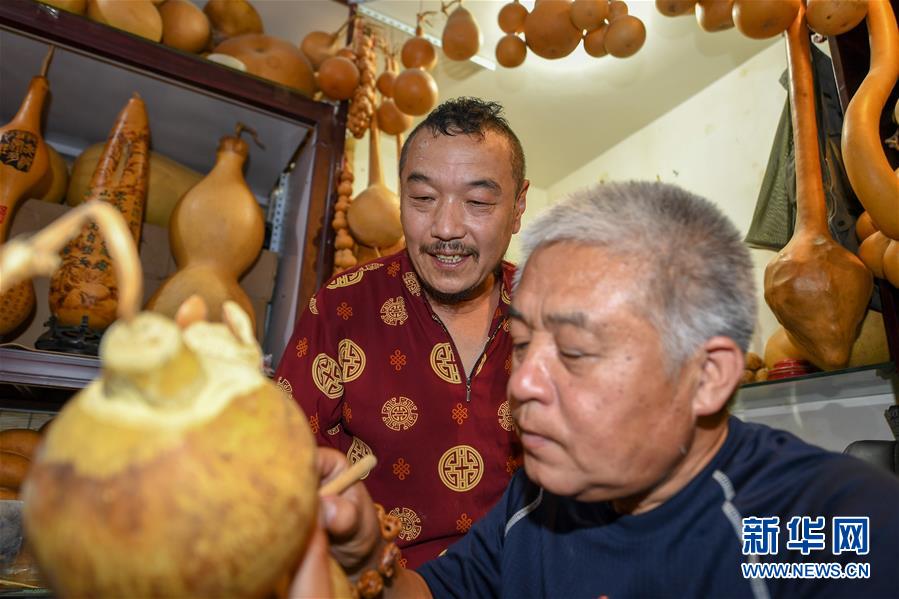 8月5日,侯景偉(左)向徒弟金志勇傳授技藝。今年55歲的吉林四平人侯景偉自幼與家人學(xué)習(xí)雕刻、烙畫(huà)藝術(shù)。經(jīng)過(guò)多年潛心研究,他將浮雕和烙畫(huà)工藝相結(jié)合,通過(guò)拋光、起稿、雕刻、烙燙、套色等十余道工藝,制作展現(xiàn)傳統(tǒng)文化、民俗故事的葫蘆工藝品。2020年,侯景偉被評(píng)為四平市非物質(zhì)文化遺產(chǎn)項(xiàng)目侯氏葫蘆雕刻烙畫(huà)代表性傳承人。他說(shuō):“希望有更多人加入到非遺傳承隊(duì)伍中,讓小葫蘆‘講’出更多民俗故事?!毙氯A社記者張楠攝