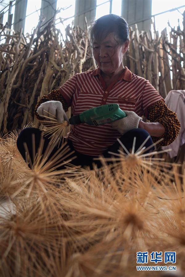 8月7日,工人利用柑橘樹(shù)枝加工吊燈飾品。2017年以來(lái),廣西桂林市永??h永安鄉(xiāng)通過(guò)幫扶返鄉(xiāng)青年創(chuàng)業(yè)的方式,建立起根雕工藝品就業(yè)扶貧車(chē)間,組織貧困群眾進(jìn)車(chē)間務(wù)工學(xué)藝,把當(dāng)?shù)刎S富的朽木和柑橘樹(shù)根枝資源利用起來(lái),加工成盆景、茶桌、吊燈等根雕工藝品,不僅幫助貧困群眾在家門(mén)口掌握一技之長(zhǎng),還讓他們?cè)诿撠氄焙髮?shí)現(xiàn)穩(wěn)定增收。新華社記者張愛(ài)林?jǐn)z