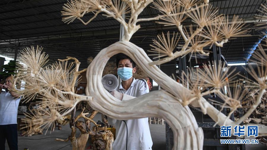 8月7日,工人在制作根雕工藝品。2017年以來(lái),廣西桂林市永??h永安鄉(xiāng)通過(guò)幫扶返鄉(xiāng)青年創(chuàng)業(yè)的方式,建立起根雕工藝品就業(yè)扶貧車(chē)間,組織貧困群眾進(jìn)車(chē)間務(wù)工學(xué)藝,把當(dāng)?shù)刎S富的朽木和柑橘樹(shù)根枝資源利用起來(lái),加工成盆景、茶桌、吊燈等根雕工藝品,不僅幫助貧困群眾在家門(mén)口掌握一技之長(zhǎng),還讓他們?cè)诿撠氄焙髮?shí)現(xiàn)穩(wěn)定增收。新華社記者張愛(ài)林?jǐn)z