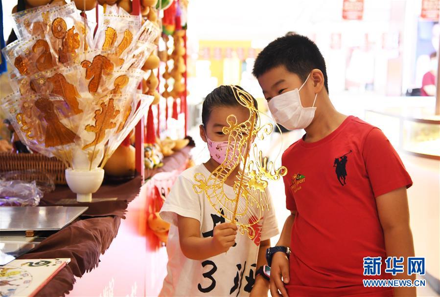 8月8日,兩名小朋友在第十八屆中關(guān)村國(guó)際美食節(jié)美食美酒嘉年華文創(chuàng)非遺展示區(qū)感受糖畫魅力。