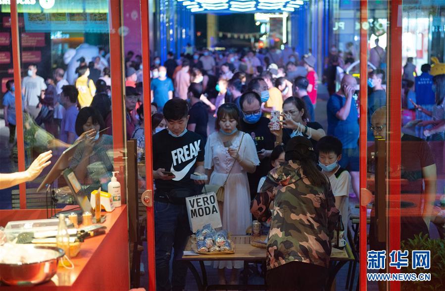 8月8日晚,市民在望京小街商業(yè)街購買小吃。新華社記者 陳鐘昊 攝