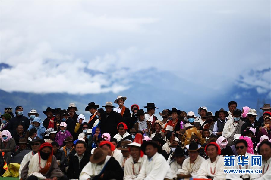 8月10日,牧民在拔河比賽現(xiàn)場觀看比賽。新華社記者普布扎西攝。