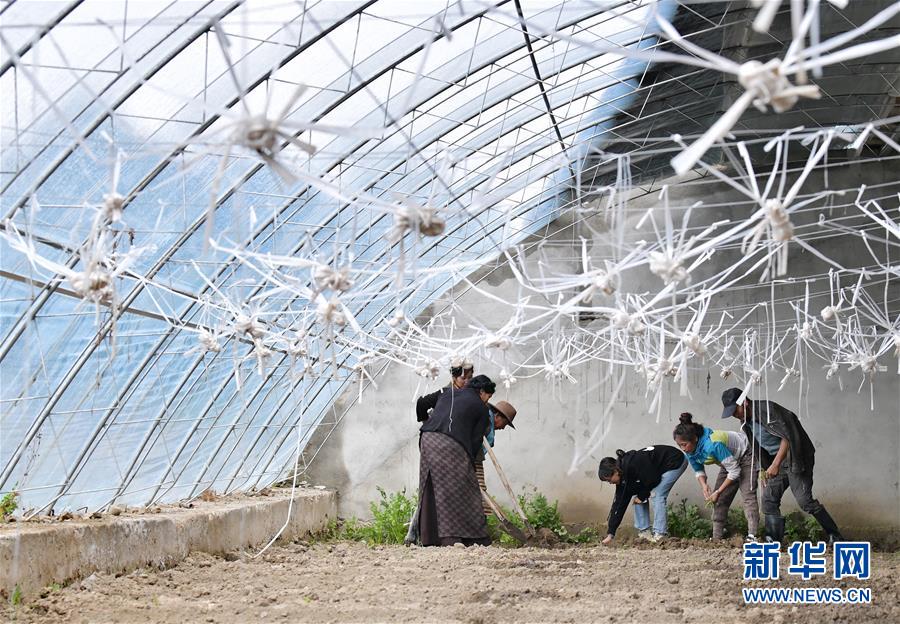格桑旺姆(右三)與姐姐德吉卓瑪(右二)帶領工人在蔬菜大棚內翻地,準備種新的蔬菜(8月3日攝)。新華社記者 李賀 攝