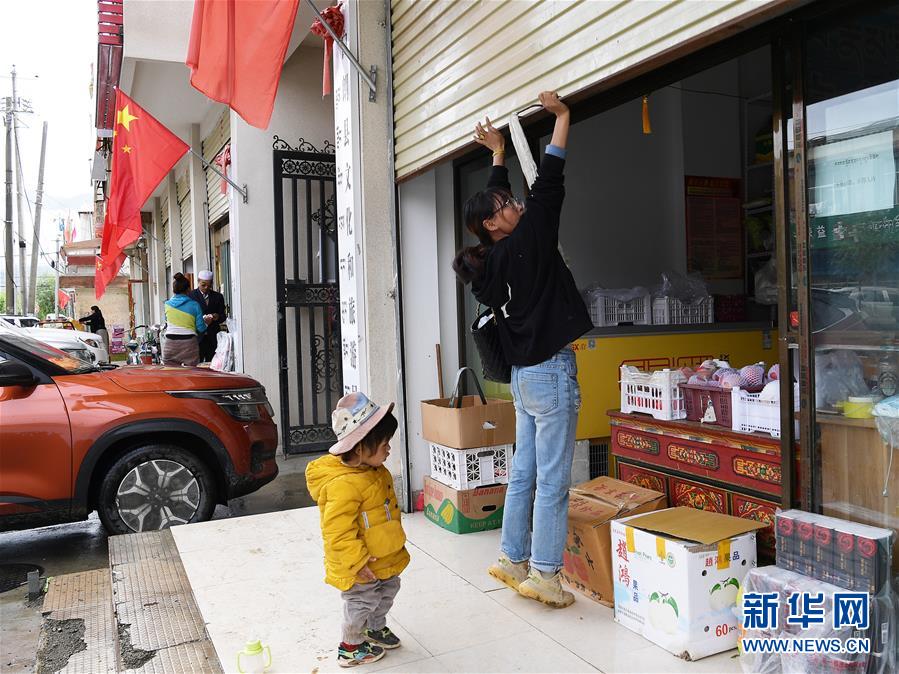 格桑旺姆推開蔬菜店的卷閘門準備營業(yè)(8月3日攝)。新華社記者 李賀 攝