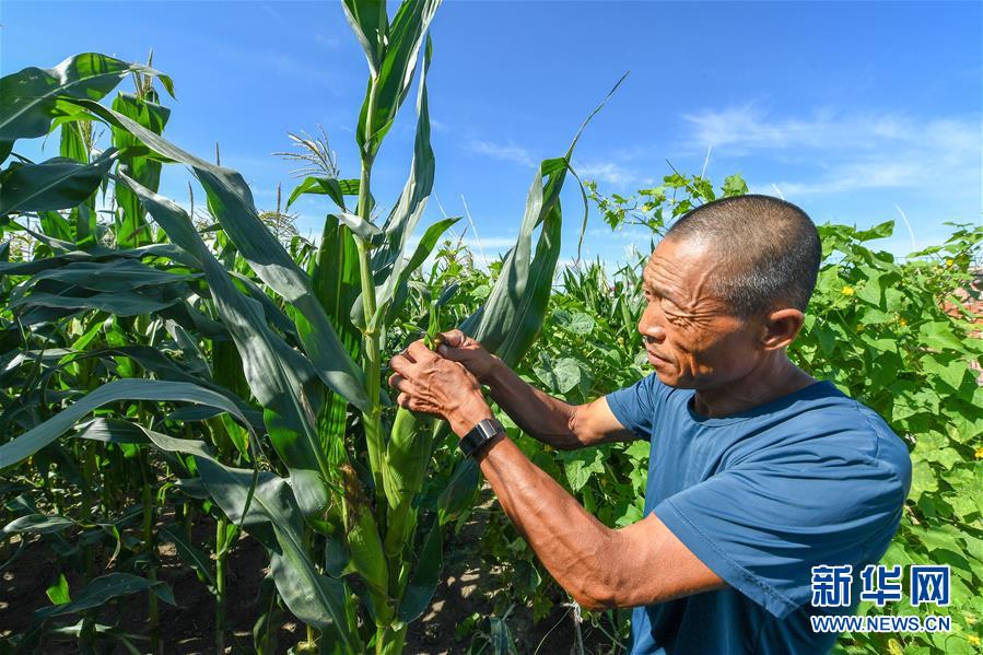 8月12日,在鎮(zhèn)賚縣黑魚泡鎮(zhèn)岔臺(tái)村,村民曲海波查看玉米長勢。新華社記者 張楠 攝