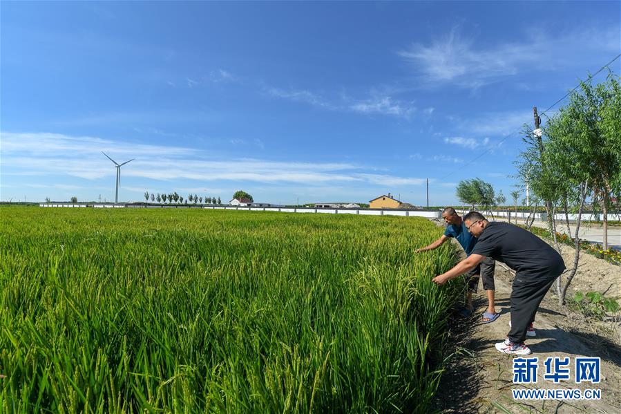 8月12日,在鎮(zhèn)賚縣黑魚泡鎮(zhèn)岔臺(tái)村,村民曲海波(左)和駐村第一書記姜宏寅在查看水稻長勢。新華社記者 張楠 攝