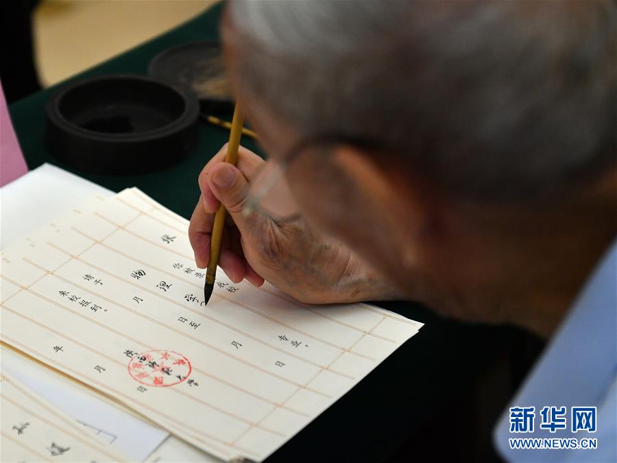 8月13日,陜西師范大學(xué)退休教師符有堂書寫錄取通知書。當(dāng)日,陜西師范大學(xué)2020年手寫錄取通知書正式開筆。該校自2007年起采用毛筆書寫錄取通知書的方式,為新生傳遞佳音。今年,學(xué)校十余位退休教師、在職教師、校友代表等書法愛好者將為約4500名新錄取的本科生送上帶著墨香的大學(xué)錄取通知書。新華社記者張博文攝