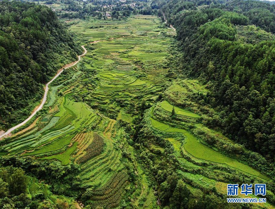 這是8月13日拍攝的鞍子鎮(zhèn)大林村梯田景色(無人機(jī)照片)。時下,重慶市彭水苗族土家族自治縣鞍子鎮(zhèn)大林村的梯田景色迷人,構(gòu)成一幅幅山鄉(xiāng)田園美景。新華社記者王全超攝
