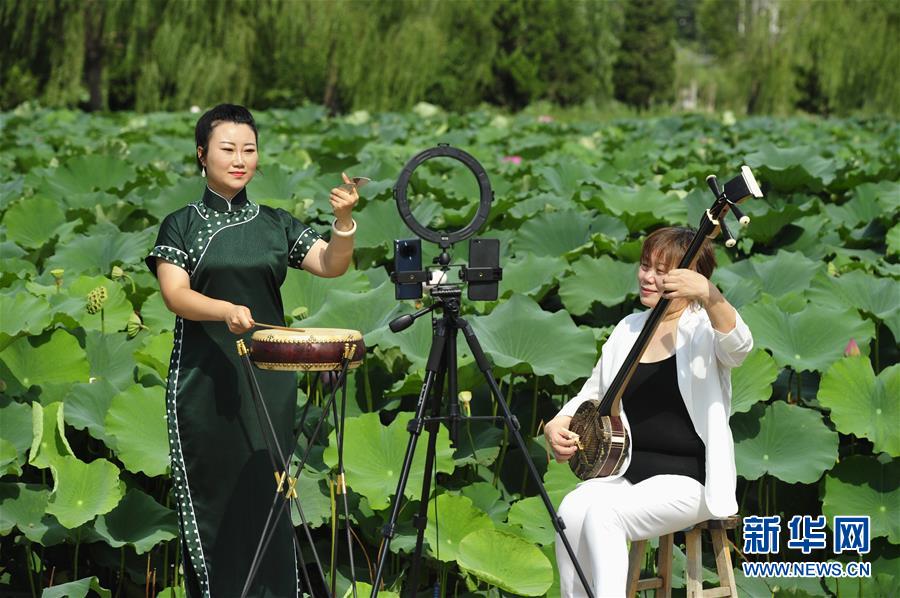 8月13日,河北省河間市西河大鼓非遺項(xiàng)目藝人李雪(左)、張領(lǐng)娣通過(guò)網(wǎng)絡(luò)直播表演西河大鼓。暑假期間,河北省河間市文化館推出非遺展演“云端”播系列活動(dòng),組織當(dāng)?shù)匚骱哟蠊姆沁z項(xiàng)目傳承人利用視頻直播的方式進(jìn)行線上展演,通過(guò)“云端”傳承非遺文化。新華社記者朱旭東攝