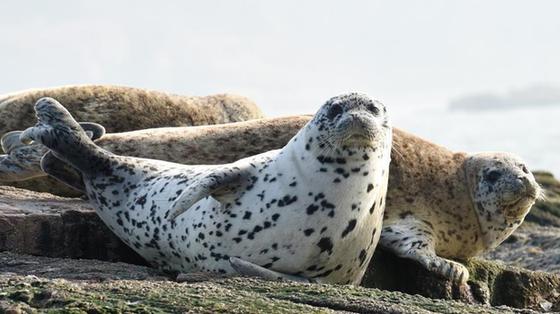 在山東省長(zhǎng)島縣釣魚島景區(qū)附近海域,幾只斑海豹趴在海中的礁石上曬太陽(yáng),憨態(tài)可掬。