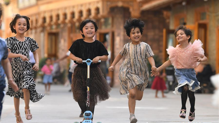 5月27日,孩子們在新疆和田市“團(tuán)城”的鴿子巷玩耍。