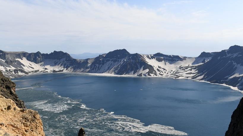 近日,長白山天池冰層逐漸消融,迎來“開冰季”。