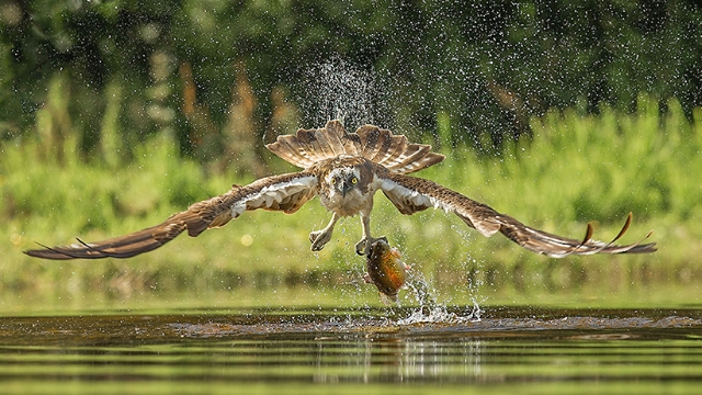 魚鷹快速俯沖而下,掠過水面,鷹爪隨即從水中成功抓起一條魚兒,濺起水花,整個過程精彩詮釋快準(zhǔn)狠。