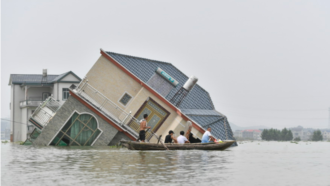 江西鄱陽村莊洪水圍困 留守村民劃船外出取生活物資