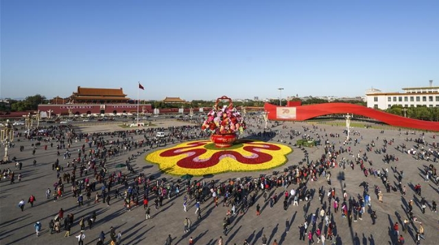 10月14日,以“花果籃”為主造型的天安門廣場(chǎng)中心花壇吸引了眾多游客參觀拍照。“花果籃”的夜景更是流光溢彩,絢爛迷人。