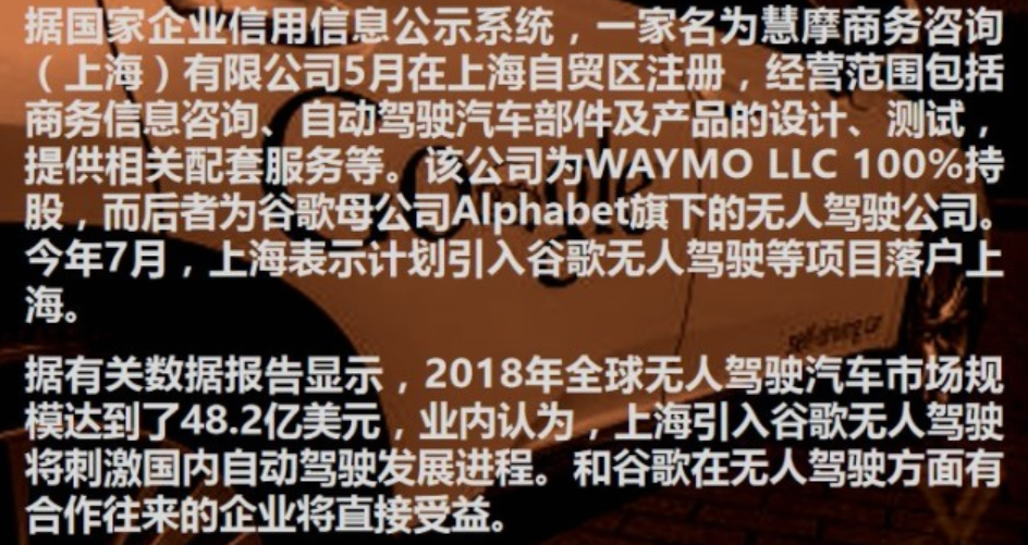 谷歌母公司Alphabet旗下研究自動駕駛的部門Waymo在自動駕駛領(lǐng)域處于全球領(lǐng)先水平,當(dāng)前其已經(jīng)完成800萬英里(約1287萬公里)自動駕駛汽車公共道路測試,模擬測試?yán)锍踢_到50億英里(約80.47億公里)。Waymo計劃在為今年下半年向部分地區(qū)的美國消費者推出無人駕駛服務(wù)。