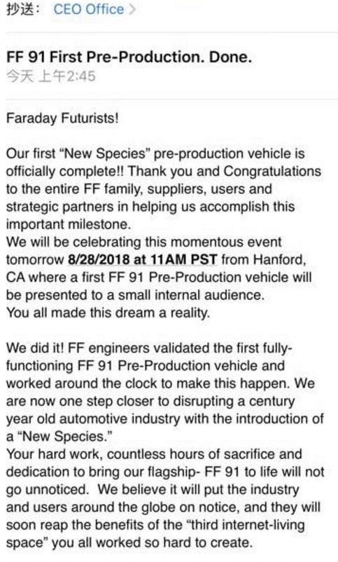 FF內(nèi)部郵件稱首輛試產(chǎn)車已完成,具備完全功能